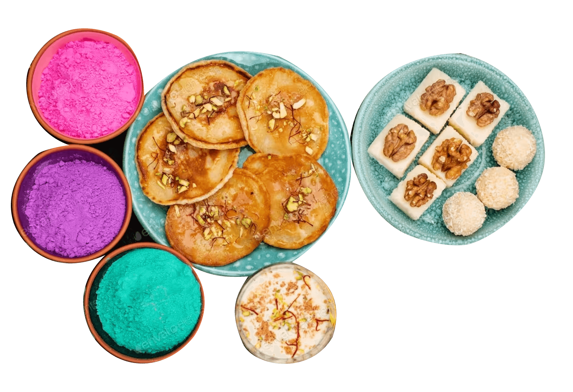 Гуджия — мягкие кондитерские изделия, наполненные сухофруктами и подаваемые с сахарным сиропом, мальпуа — жареные мини-блинчики, тхандай — сладкий молочный напиток, который ароматизирован кардамоном, шафраном, семенами фенхеля и розовой водой